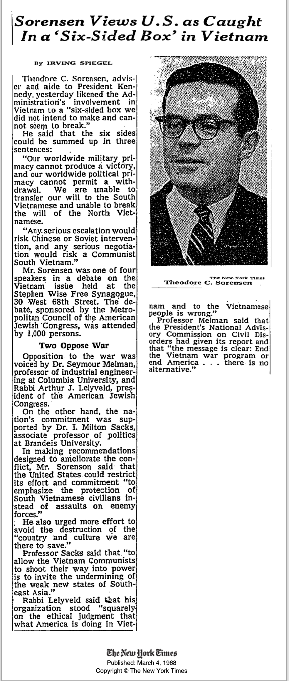 It was in this political atmosphere that, at the beginning of March 1968, the meeting in New York was held. A thousand people attended. The New York Times reported. Sorensen was one of four speakers. The box, he said, was one the USA “did not intend to make and cannot seem to break.”