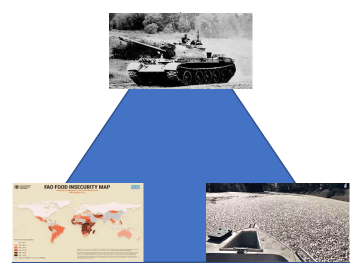 A different question is whether the focus is on the direct challenge to human well-being and security posed by ecological disruption (e.g., in the form of more frequent and powerful hurricanes and cyclones), or on the knock-on consequences of disruption (e.g., the loss of livelihood, such as from fishing, caused by the formation of a dead zone in a river, as seen in the photo below, or the mass movement of people because an area has become inhabitable)? Again, irritatingly enough, my answer is both – direct and indirect impacts alike are of concern from a peace and security perspective.