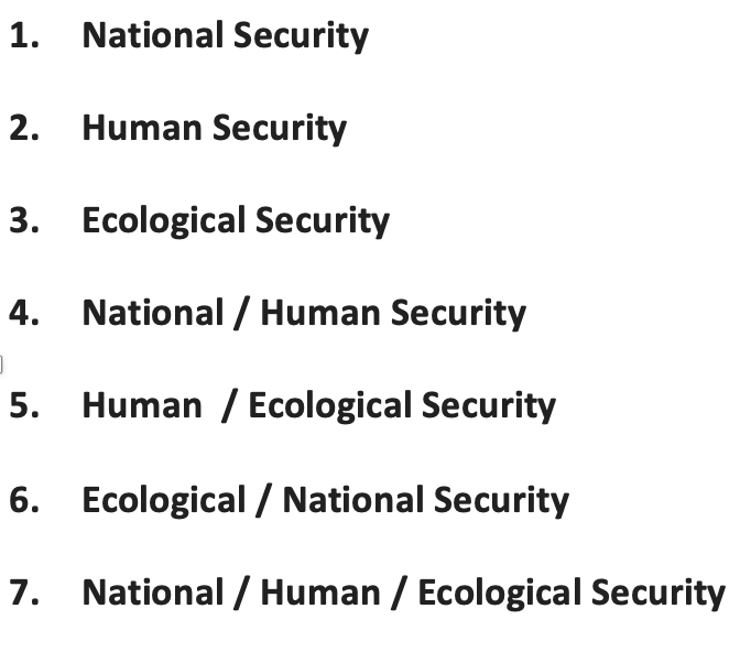 Bringing ecological security into this frame is straightforward enough. How should a responsible and well-governed state try to look after the well-being of its citizens, in a dangerous world with this combination of challenges to national security, human security and ecological security?