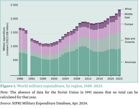 As high as these figures are, a careful look offers even more cause for concern. The global economic burden of military spending is not exceptionally large by historical standards. In 2023, military spending took up 2.3 percent of global GDP. Looking back to two moments in the Cold War, a World Bank estimate utilising SIPRI data indicates the comparable figures were 5.9 percent in 1963 and 4.2 percent in 1983. This suggests that, though adjusting state budgets may be politically contentious with negative social effects as other needs go unmet, there is in principle plenty of potential for world military spending to rise yet higher.