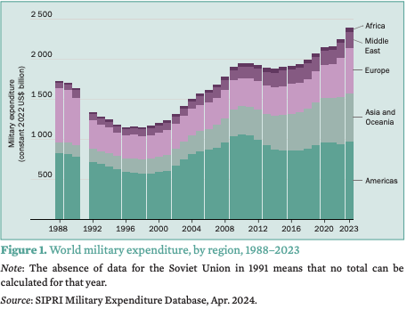 As high as these figures are, a careful look offers even more cause for concern. The global economic burden of military spending is not exceptionally large by historical standards. In 2023, military spending took up 2.3 percent of global GDP. Looking back to two moments in the Cold War, a World Bank estimate utilising SIPRI data indicates the comparable figures were 5.9 percent in 1963 and 4.2 percent in 1983. This suggests that, though adjusting state budgets may be politically contentious with negative social effects as other needs go unmet, there is in principle plenty of potential for world military spending to rise yet higher.